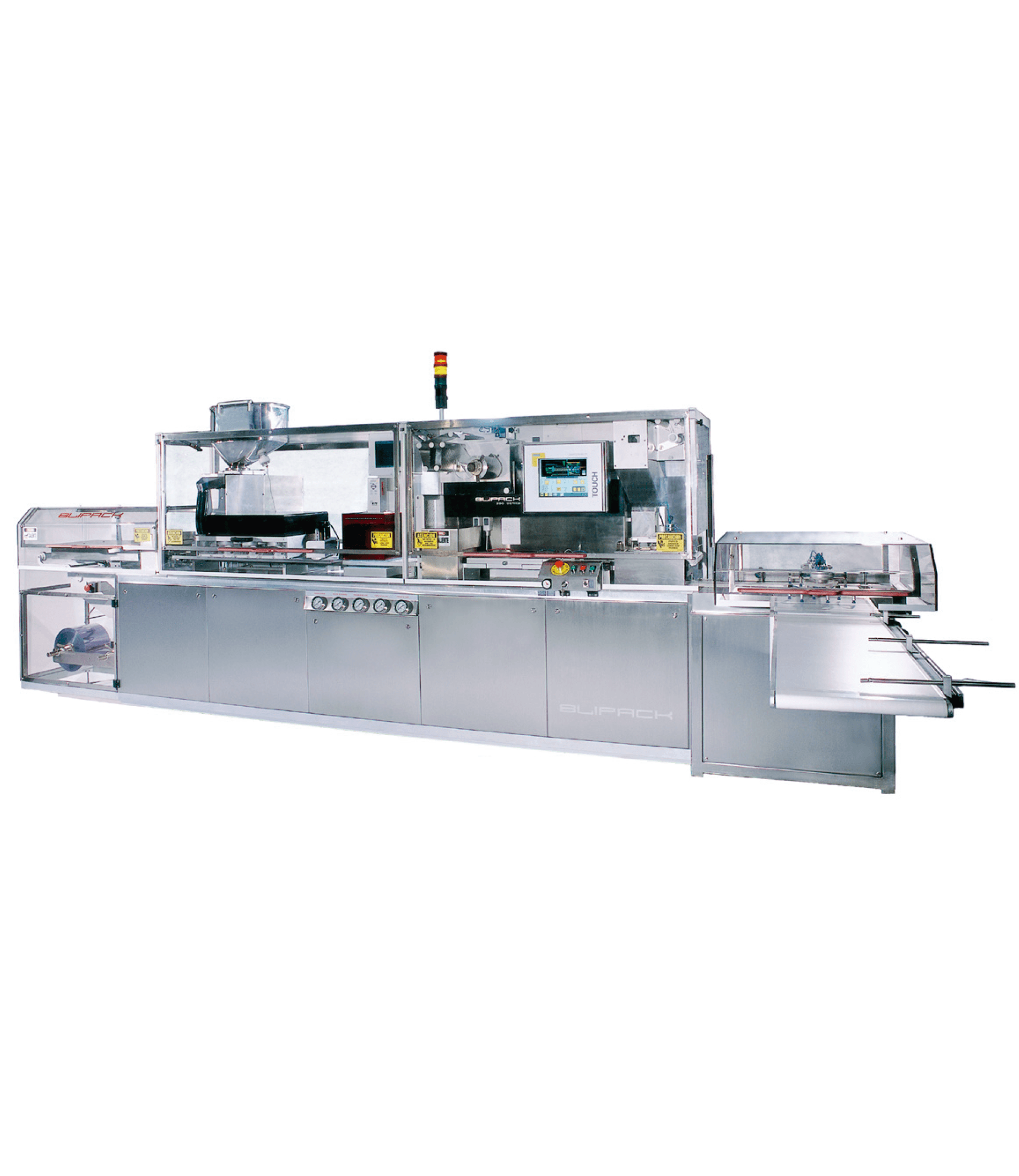 Mecánica robusta, de fácil acceso y simple operación. Totalmente cubierta de acero inoxidable con paneles insonorizantes. Tablero eléctrico modular con componentes de primera línea de acuerdo a nomras DIN-CE con circuito de mandos de 24 V. Opción de versión de máquina totalmente controlada por PLC con pantalla “touch screen” para visualizar o modificar parámetros. Ofrecemos amplia gama de accesorios y alimentadores disponibles para incrementar la producción o trabajar en línea con otros equipos.Fáciles y seguras de operar. Todas las zonas peligrosas con riesgo de atrapamiento, cortes o quemadoras están protegidas por defensas y puertas con switches de seguridad. Marca: Blipack
