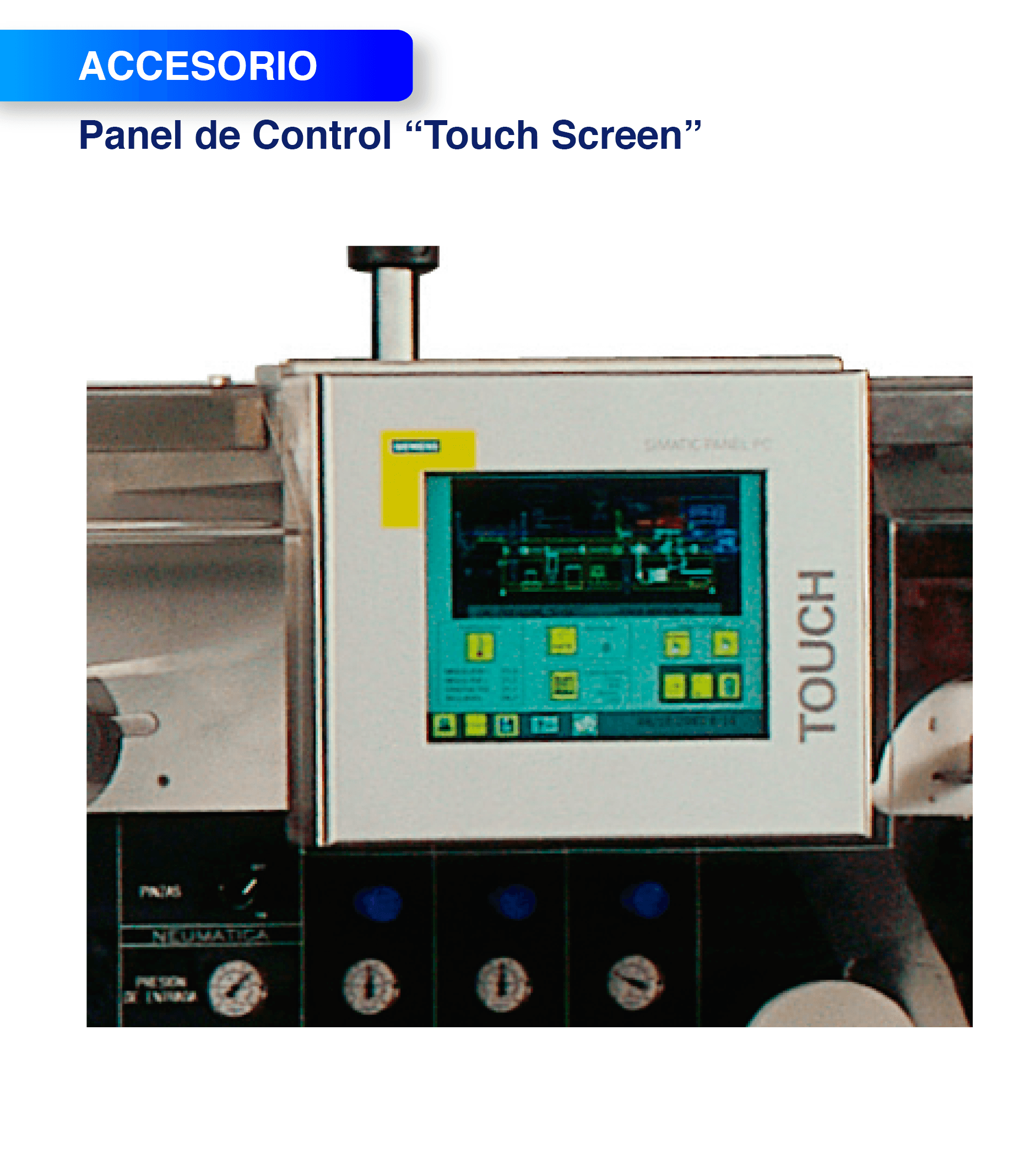 Opción de versión de máquina totalmente controlada por PLC con pantalla "touch screen" para visualizar o modificar parámetros.